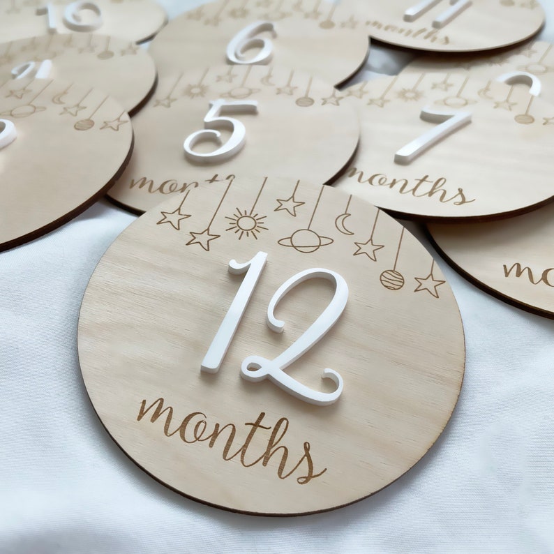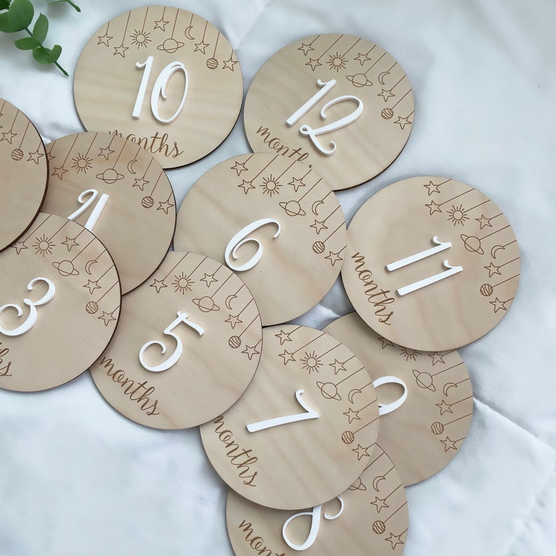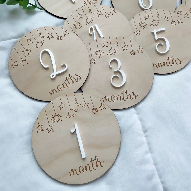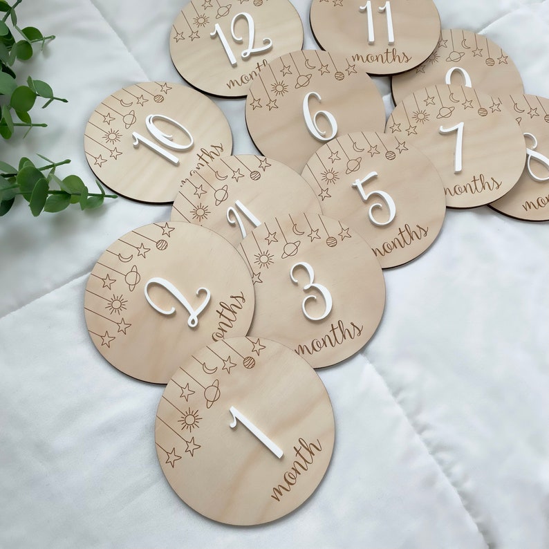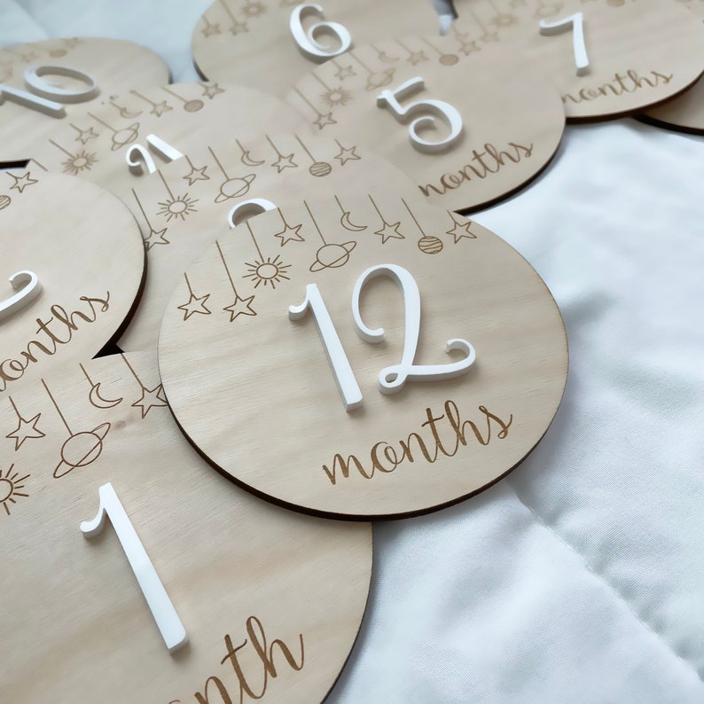 These beautiful Wooden Baby Milestones are Laser cut and Engraved from Baltic birch plywood and will Have Acrylic color of your choice 🤍