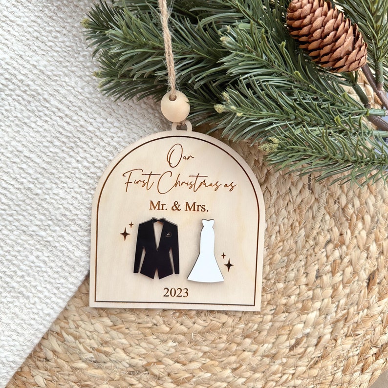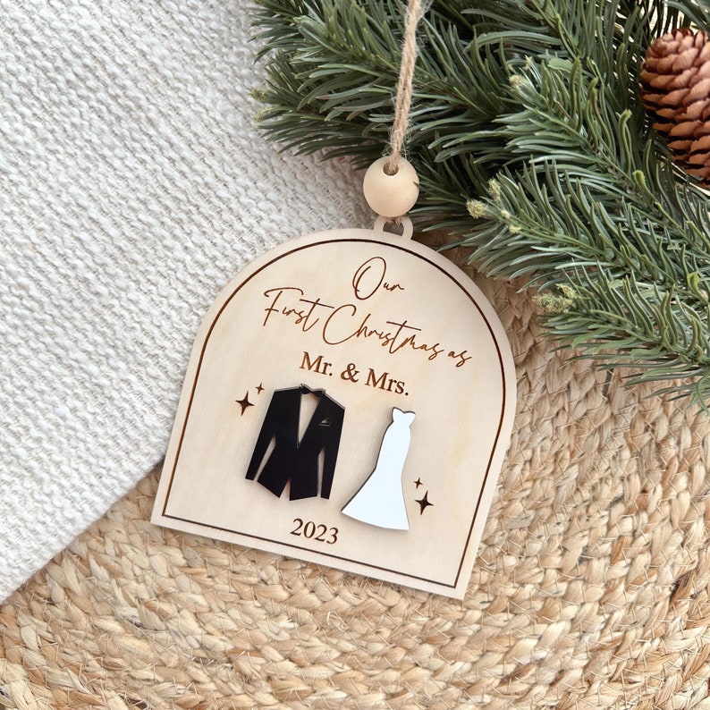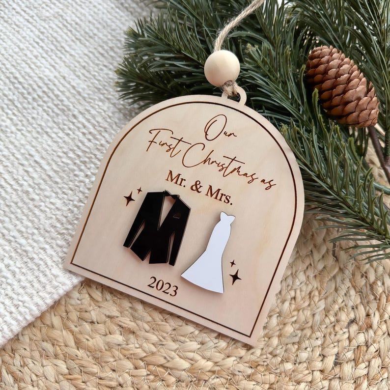 Customize this ornament with the year! “Our First Christmas Married Ornaments” measure approximately 4.5″ X 5″. These beautiful ornaments are laser cut from birch plywood. Each ornament includes a wooden bead and string to hang your ornament, and each ornament comes packaged in an organza bag for easy gifting❤️🎄