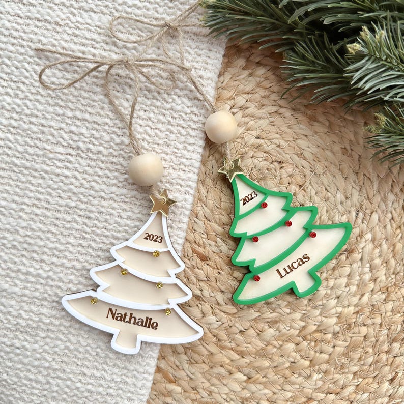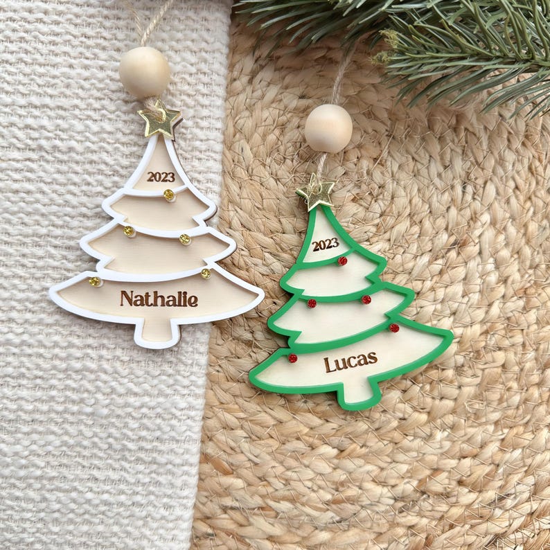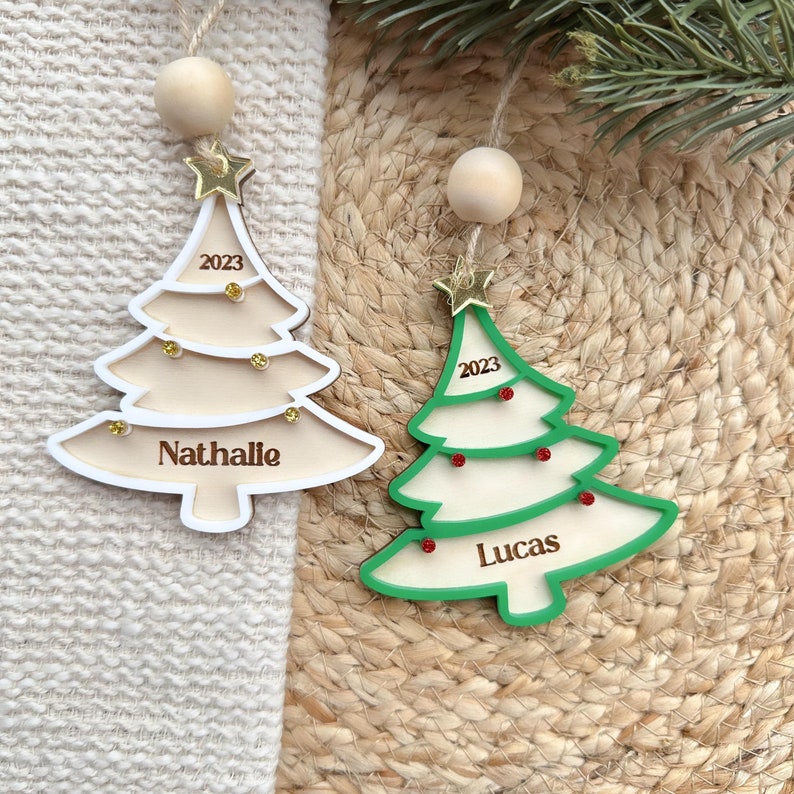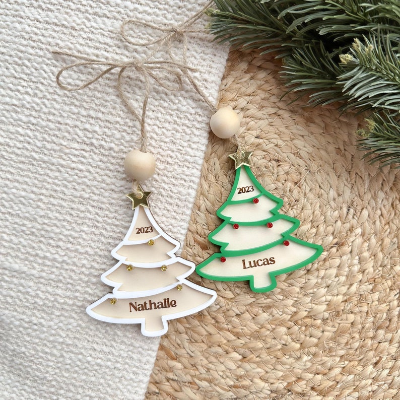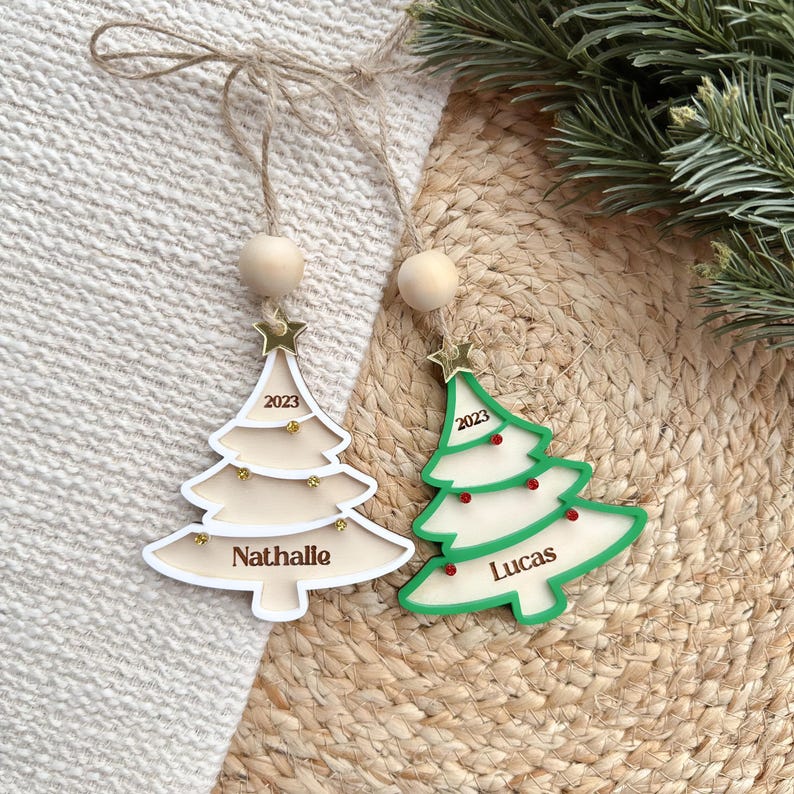 These Christmas Tree shaped ornaments measure approximately 3.25″ X 3.75″. You may select the Tree color and ornament color along with personalize this ornament with a first name and year! These beautiful ornaments are laser cut from birch plywood. Each ornament includes a wooden bead and string to hang, and each ornament comes packaged in an organza bag for easy gifting❤️🎄