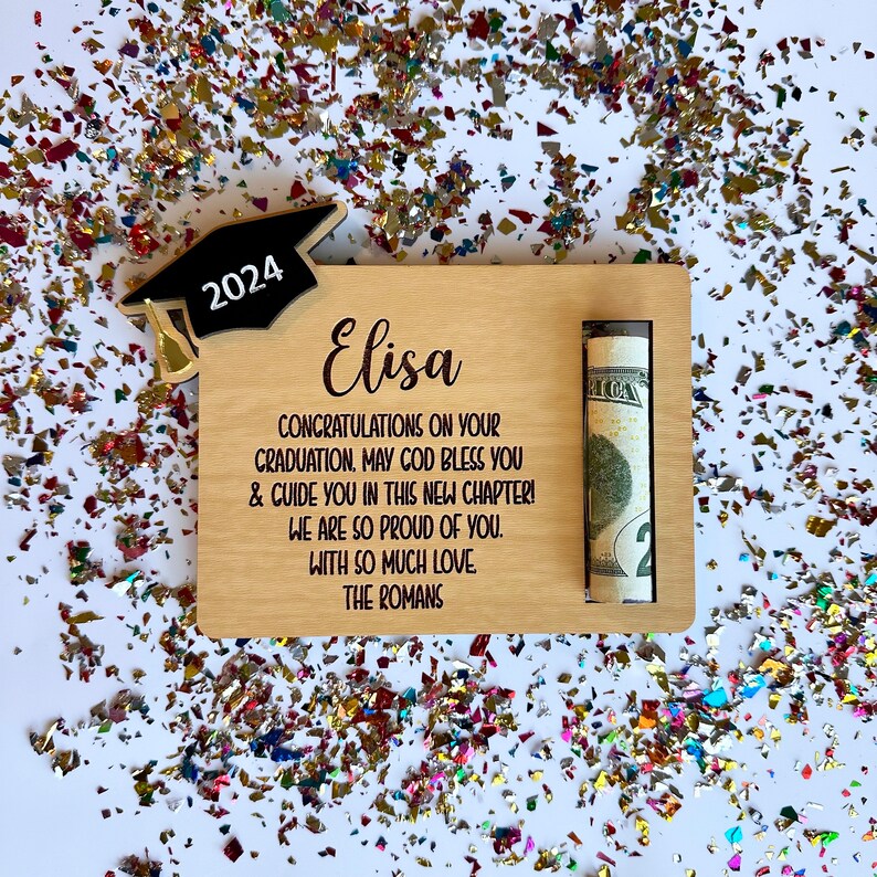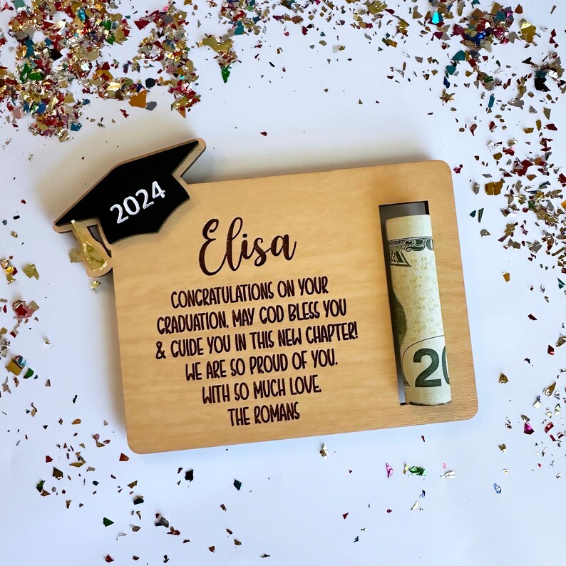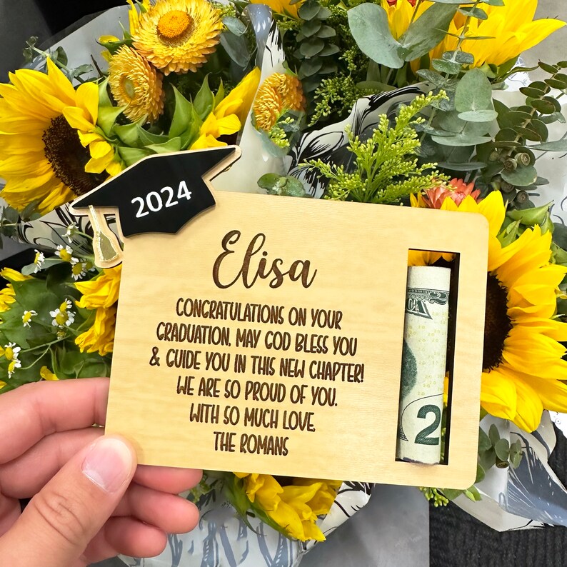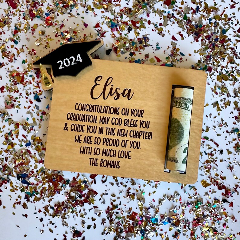 You may personalize these Graduation money holder cards with a name, year, and a special message. Laser cut and engraved out of high quality Mdf.