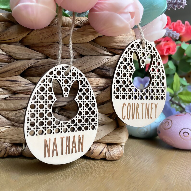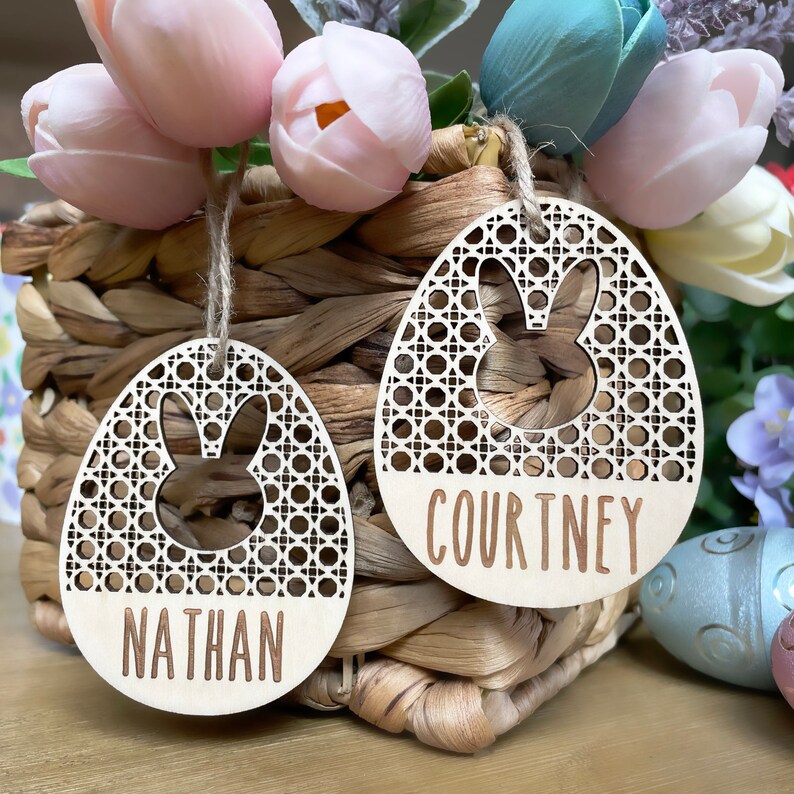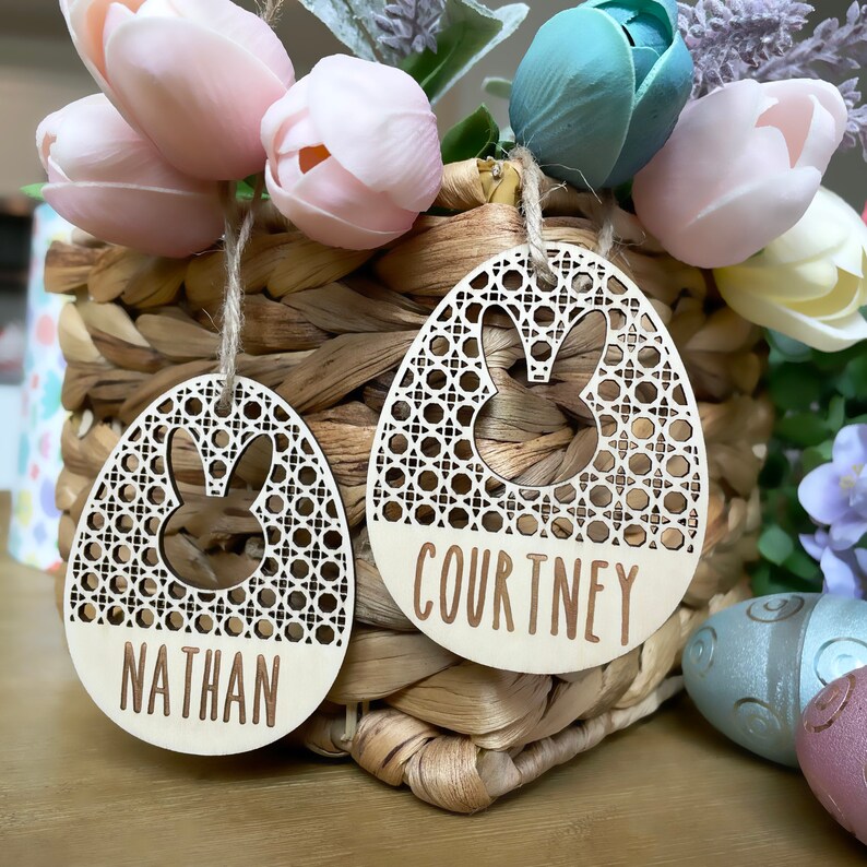 Rattan Easter Bunny Name Tags measure 3″ x 2.38″. These beautiful Tags are Laser cut and Engraved from Baltic birch plywood. Each Tag will include twine string and will be individually packaged in an Organza Bag for easy gifting❤️